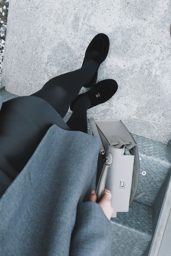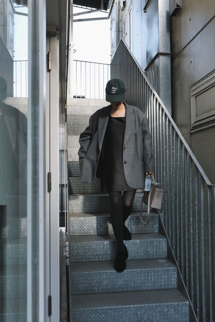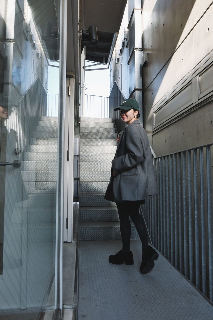 ボクシーなシルエットがマニッシュな余韻を残しつつ、軽やかに揺れるラインの美しいジャケット。黒のタイツとローファーで足元をシックにまとめ、グレージュのバッグでニュアンスをひとさじ。