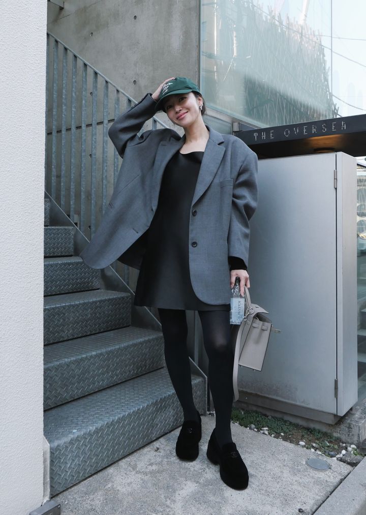 高品質ポリエステル×ヴァージンウールのオーバーサイズジャケットを羽織って、ブラックにグレーを重ねることで深みのある秋冬の表情に。