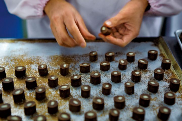 成形し小さくカットした生地を一つ一つ丁寧に並べる。すべて手作業、ずっと変わらぬ製法で作られる。 撮影=川部米応