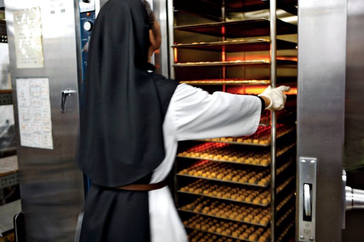 労働のひとつとして実践されているお菓子作りに従事しているのは、数名のシスターたち。この日は2種類のクッキーが製作されていました。大きなオーブンからこんがりといい色に焼き上がったクッキーが出し入れされるたび、工房全体にふんわりと甘い香りが立ち込めます。労働は祈りの延長であり、粉をふるう、焼くといった一つ一つの作業を丁寧に行うことこそが神への奉仕なのです。