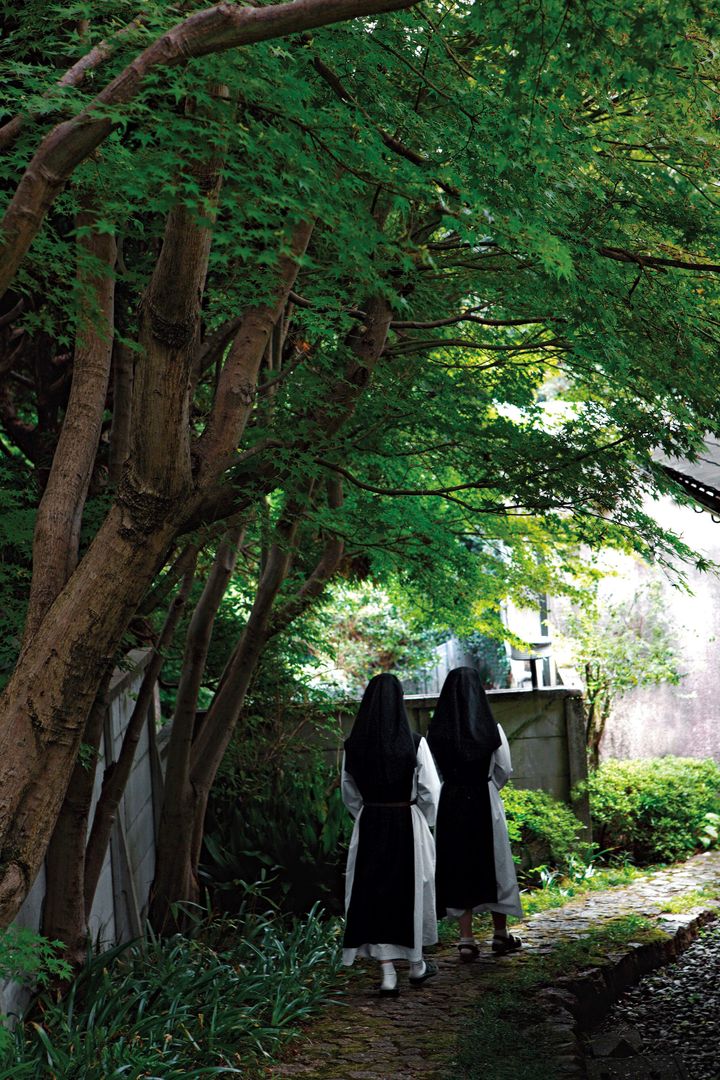 緑の木立に囲まれた緩やかな勾配の遊歩道が続く、六甲山麓の豊かな自然に包まれた西宮の聖母修道院。村野藤吾設計によるモダニズム建築の中で共同生活を送るシスターたち。神と向き合い、対話する時間が静かに流れている。