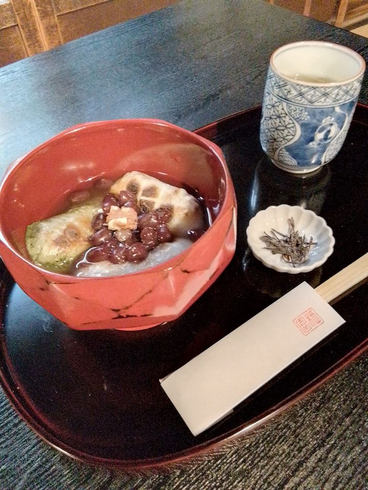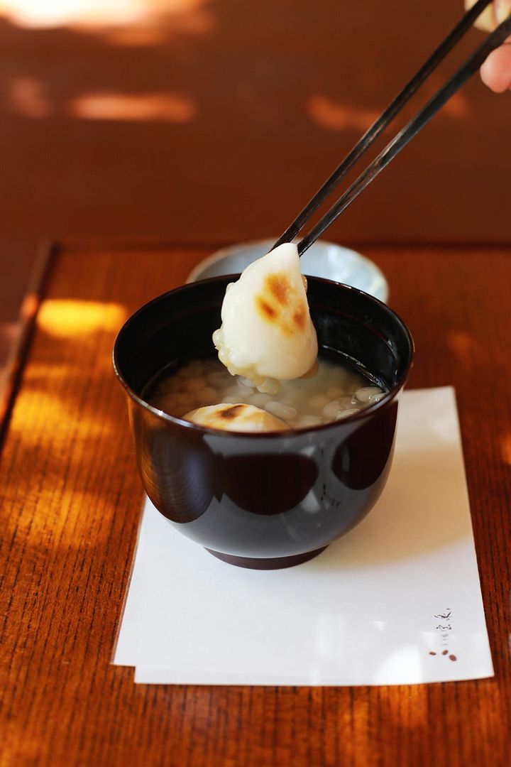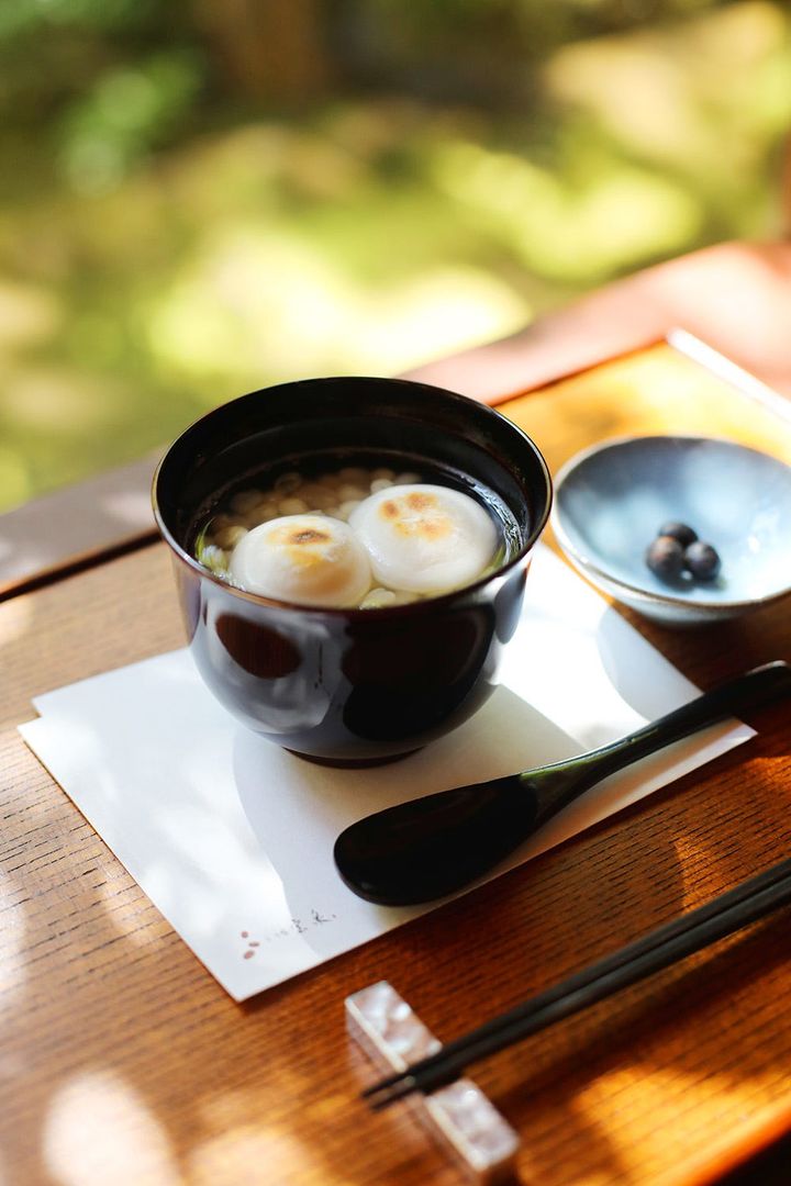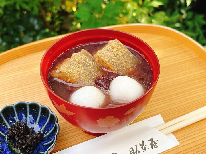 お椀の蓋を開けると、ふくよかな香りが立ち上り、ころんとした丸みのある可愛らしい餅と、粒感を残した小豆が姿を現します。ほんのり焼き目がついた餅は、近江米のもち米を自社でついた風味豊かな味わいです。