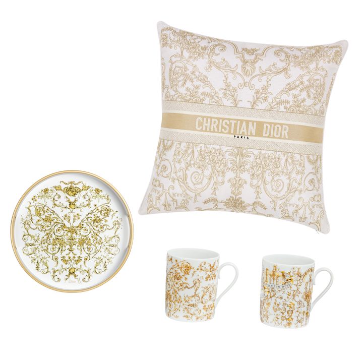 デザートプレート【直径21㎝】¥27,500、<a href="https://www.dior.com/ja_jp/fashion/products/HYJ02MCP0L_C190" target="_blank" rel="nofollow">マグカップセット¥93,000</a>、スクエアクッション¥205,000 Hearst Owned