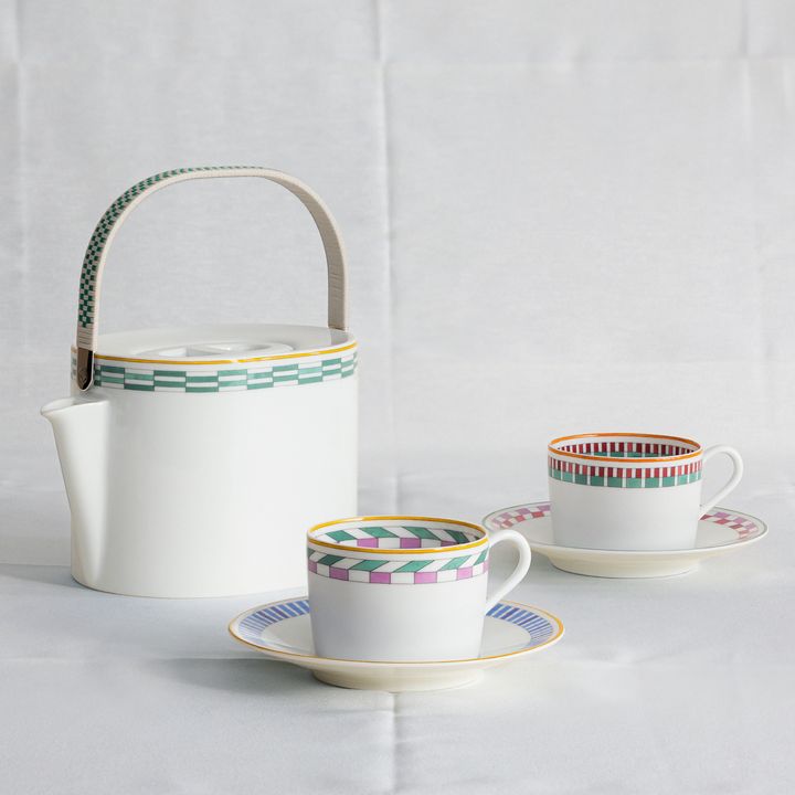 “エルメス・アン・コントルポワン”ティーポット¥226,600、<a href="https://www.hermes.com/jp/ja/product/%E3%83%86%E3%82%A3%E3%83%BC%E3%82%AB%E3%83%83%E3%83%97%EF%BC%86%E3%82%BD%E3%83%BC%E3%82%B5%E3%83%BC-%E3%80%88%E3%82%A8%E3%83%AB%E3%83%A1%E3%82%B9%E3%83%BB%E3%82%A2%E3%83%B3%E3%83%BB%E3%82%B3%E3%83%B3%E3%83%88%E3%83%AB%E3%83%9D%E3%83%AF%E3%83%B3%E3%80%89-no1-P065016P/" target="_blank" rel="nofollow">ティーカップ&ソーサ― 各¥42,900</a> Hearst Owned