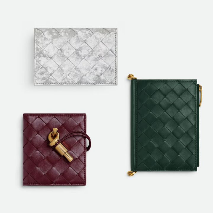 〈左上から時計回りに〉<a href="https://www.bottegaveneta.com/ja-jp/%E3%82%A4%E3%83%B3%E3%83%88%E3%83%AC%E3%83%81%E3%83%A3%E3%83%BC%E3%83%88-%E3%83%93%E3%82%B8%E3%83%8D%E3%82%B9%E3%82%AB%E3%83%BC%E3%83%89%E3%82%B1%E3%83%BC%E3%82%B9-%E3%82%B7%E3%83%AB%E3%83%90%E3%83%BC-814011537.html?utm_source=google&utm_source_platform=SA360&utm_medium=cpc&utm_campaign=JP%7CJA%7CPMX%7CAll%7CSLG%7CU%7C/&utm_id=21308267256&gclsrc=aw.ds&gad_source=1&gad_campaignid=21308308773&gbraid=0AAAAAph0GbFz-RsoU5EhCEegYBqTfCdyK&gclid=Cj0KCQiAoZDJBhC0ARIsAERP-F_WxZd9395EDduTo1-kRBljEK8XYqCccoeEBiWDv-S_gTIWrKL3siwaAtmJEALw_wcB" target="_blank" rel="nofollow">“イントレチャート ビジネスカードケース”【H7.8×W11×D2.5㎝】¥93,500、</a><a href="https://www.bottegaveneta.com/ja-jp/%E3%82%BD%E3%83%AB%E3%82%B9%E3%83%86%E3%82%A3%E3%82%B9-%E3%83%9F%E3%83%87%E3%82%A3%E3%82%A2%E3%83%A0-%E4%BA%8C%E3%81%A4%E6%8A%98%E3%82%8A%E3%82%A6%E3%82%A9%E3%83%AC%E3%83%83%E3%83%88-%E3%82%A8%E3%83%A1%E3%83%A9%E3%83%AB%E3%83%89-%E3%82%B0%E3%83%AA%E3%83%BC%E3%83%B3-814085005.html?utm_source=google&utm_source_platform=SA360&utm_medium=cpc&utm_campaign=JP%7CJA%7CPMX%7CAll%7CSLG%7CU%7C/&utm_id=21308267256&gclsrc=aw.ds&gad_source=1&gad_campaignid=21308308773&gbraid=0AAAAAph0GbFz-RsoU5EhCEegYBqTfCdyK&gclid=Cj0KCQiAoZDJBhC0ARIsAERP-F9NL0W3OKYUr71Sg2MGaKY7zDuNDMiKKeawxYktCFWjFzeh__92oJsaAgFDEALw_wcB" target="_blank" rel="nofollow">“ソルスティス ミディアム 二つ折りウォレット”【H14.5×W11×D2㎝】¥141,900、</a><a href="https://www.bottegaveneta.com/ja-jp/%E3%82%A2%E3%83%B3%E3%83%87%E3%82%A3%E3%82%A2%E3%83%BC%E3%83%A2-%E3%83%95%E3%83%A9%E3%83%83%E3%83%97-%E3%82%AB%E3%83%BC%E3%83%89%E3%82%B1%E3%83%BC%E3%82%B9-%E3%83%94%E3%83%83%E3%82%AF%E3%83%AB-836943VCPP23293.html" target="_blank" rel="nofollow">“アンディアーモ フラップカードケース”【H9.8×W8.7×D0.5㎝】¥141,900</a> Hearst Owned