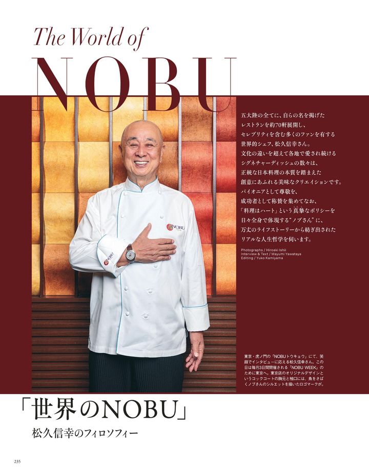 五大陸の全てに、自らの名を掲げた レストランを約70軒展開し、 セレブリティを含む多くのファンを有する世界的シェフ、松久信幸さん。 文化の違いを超えて各地で愛され続ける シグネチャーディッシュの数々は、正統な日本料理の本質を踏まえた創意にあふれる美味なクリエイションです。 パイオニアとして尊敬を、成功者 として称賛を集めてなお、「料理はハート」という真摯なポリシーを日々全身で体現する“ノブさん”に、万丈のライフストーリーから紡ぎ出されたリアルな人生哲学を伺います。