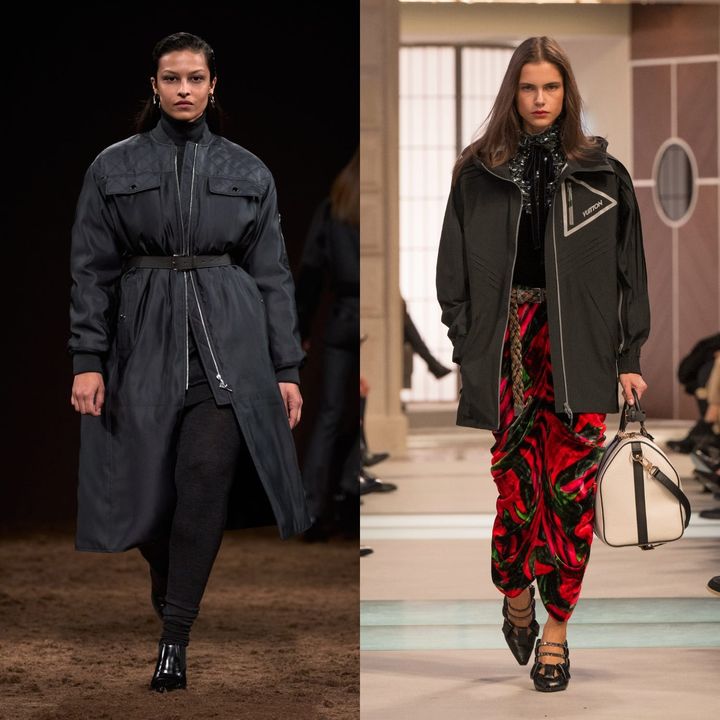 HERMÈS(エルメス)は、胸元のポケットが印象的なロング丈のボンバージャケットにタイトなレギンスを合わせ、ボリュームのあるシルエットをすっきりとまとめています。ポインテッドトゥのブーツで全体の印象を引き締め、カジュアルに傾かないバランスを保っています。そして、ドレスに用いられるような鮮やかなパターンのペンシルスカートを合わせたのは、LOUIS VUITTON(ルイ・ヴィトン)。ストリートを思わせるジャケットに対照的な要素を重ね、計算されたアンバランスが美しく調和しています。
