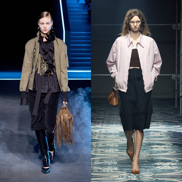 DIOR(ディオール)は、カーキのジャケットを羽織ったスタイルに、コルセットやラッフルなどのフェミニンな要素を散りばめ、スポーティとエレガンスの境界を軽やかに行き来しています。タイトスカートにヒールを合わせたPRADA(プラダ)は、一見ドレッシーな印象ながら、ブルゾンをレイヤードすることでアンニュイな雰囲気を漂わせています。