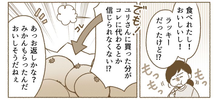 めったに買えないフルーツタルトをせっかくユリさんにも買ってきてあげたのに、それがみかんに代わるなんて……信じられません。