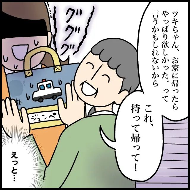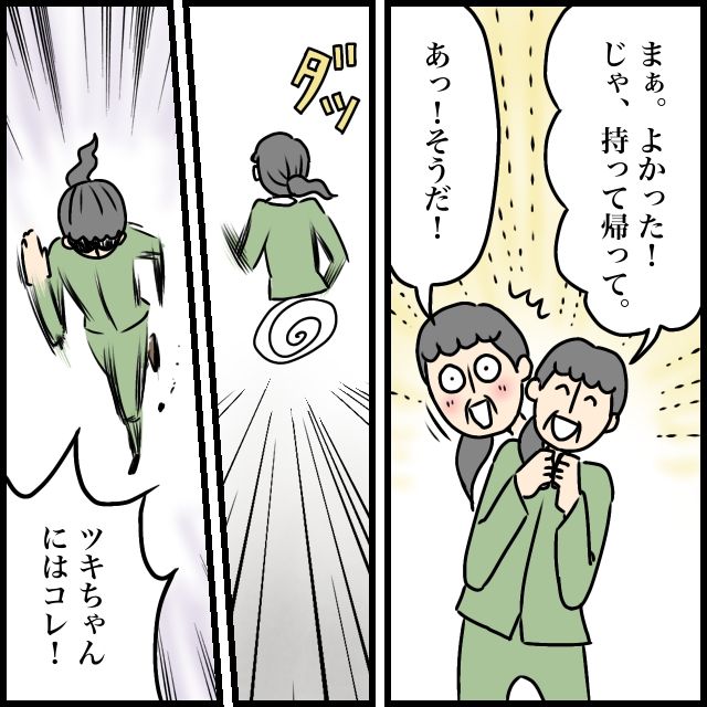 義母は嬉しそうに「よかった!じゃ持って帰って」と言うと、「あっ、そうだ!」と突然何かを思い出したように部屋の奥へ走っていき、「ツキちゃんにはコレ!」と言いながら猛スピードで戻ってきました。