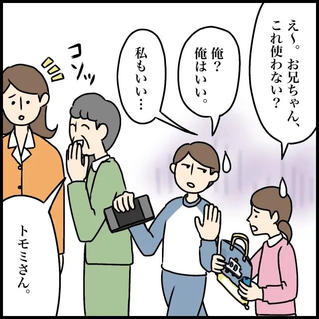 ジュンペイのお古を押し付けられ困惑するツキ。「お兄ちゃん、これ使わない?」とヒロムに声をかけるも、「俺はいい」とあっさり断られてしまいます。その様子を見た義母が、「トモミさん」と私にこっそり声をかけてきました。