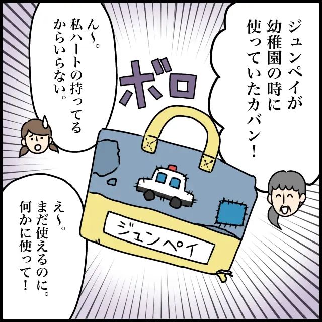 義母がツキに差し出したのは、なんとジュンペイが幼稚園の時に使っていたカバンでした。カバンとしてはまだ使えるかもしれませんが、所々傷や汚れが目立ちます。ツキは「ん~私ハートの持ってるからいらない」と断りますが、義母は「え~まだ使えるのに、何かに使って!」と無理やり押し付けます。