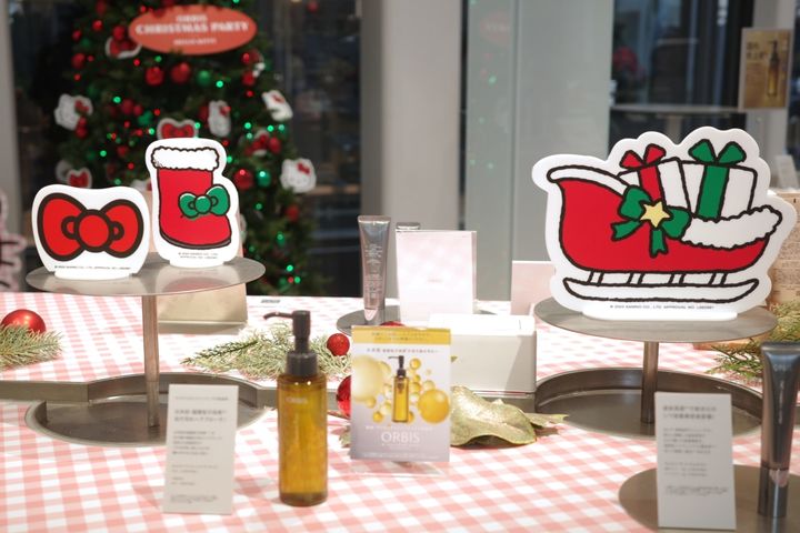 店内に入るとさらにハローキティがたくさん! クリスマスモチーフのイラストもあいまって、ホリデーシーズンの気分を盛り上げてくれますよ。これからの時期、クリスマスプレゼントを探しにいく方も多いはず。『SKINCARE LOUNGE BY ORBIS』でクリスマスプレゼント探しをするのも良いですね!