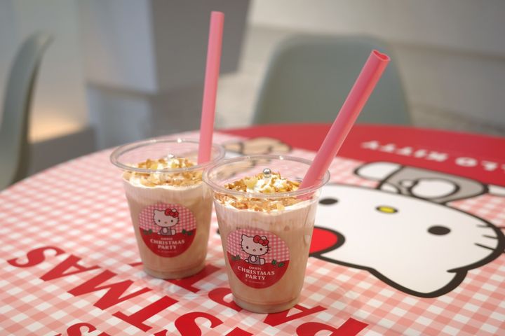 サクサクとした食感が楽しめるフレークとドライアップル、キャラメルソースもアクセント。クリスマスドリンクを購入した方にプレゼントされるハローキティコラボデザインのめじるしチャーム2個と一緒に写真を撮りたくなるドリンクです!