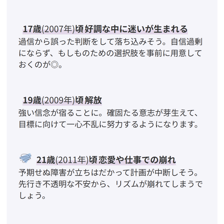 1~60歳までに訪れる人生の転機を占うことができます。運気最高潮の年、破壊の年、結婚の年、金運アップの年……。あなたは何歳のときに訪れる? 今すぐ占ってみましょう!