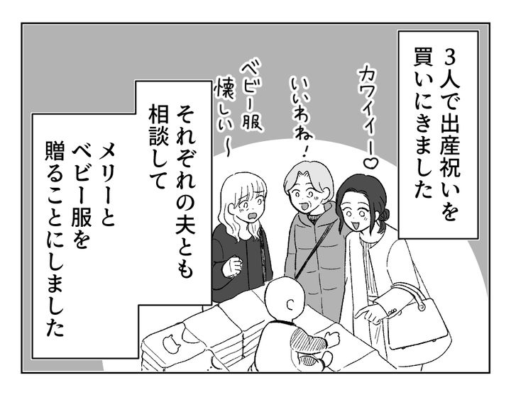 私(ハルミ)の夫(リョウヘイ)は、3きょうだいの次男です。長男のケンジさんの奥さんはアイさん。最近結婚したのは三男のトモヤくんで、奥さんのユナちゃんとはすぐに意気投合しました。義実家はそれぞれの家から20~30分の場所にあり、義母はとても優しくて気遣いのできる人。私とアイさんとユナちゃん、そして義母を含めて、4人で仲良くさせてもらっています。ユナちゃんの出産が近づき、私たちは出産祝いを共同で買うことにしたのでした。