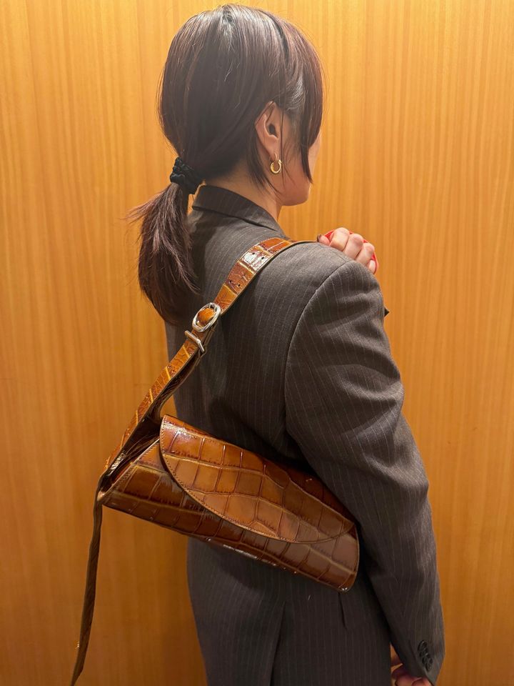 「髪を赤くしてからブラウンの服をよく着るようになり、同系色のバッグを探しているときに出合いました。“カンノーロ”はオリーブをすでに愛用していて、あのモダンなシルエットには元々ほれ込んでいましたが、ブラウンのワントーンでも埋もれずに引き締めてくれる“ツヤっとした型押し”の質感が決め手に。黒い服にもきれいに差し色になって、思っていた以上に万能。気づけば毎日のように手に取ってしまうバッグです」