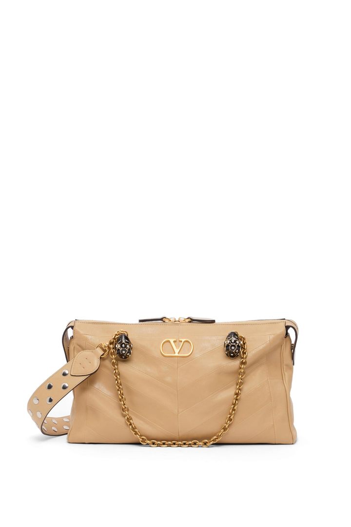 2025年秋冬コレクションのランウェイで存在感を示した“パンテア”は、「ヴァレンティノ ガラヴァーニ」の新たなシグネチャー。マットとつや、異なる質感のナッパレザーをV字に組み合わせたパッチワークが奥行きを生み、持つ人の装いにリズムを与える。エナメルで仕上げたパンサーのヘッドをあしらったチェーンは、ひと目で心を奪うポイントに。