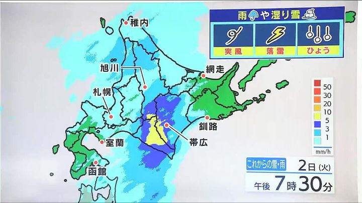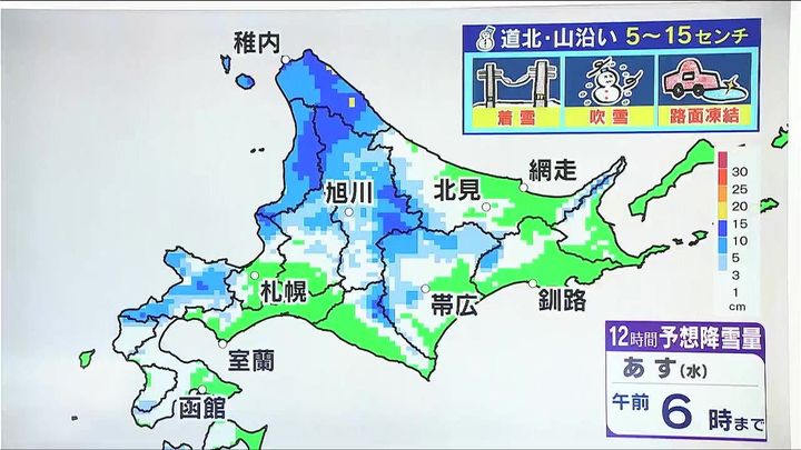 宗谷や留萌、上川北部など道北や山沿いの多いところで15センチです。湿った雪による着雪や吹雪、路面凍結にも注意してください。また、帯広や北見など道東方面の内陸でもうっすら積もるおそれがあります。