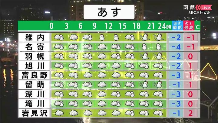 あす3日(水)夜から木曜朝は広く雪が積もるでしょう。その後も金曜にかけて道南では雪かきが必要になりそうです。最高気温でも0度くらいの寒さが続くため、スリップ事故に注意してください。