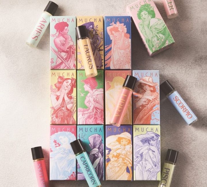 上段左から:ゾディアックサイン フレグランスオイル牡羊座、牡牛座、双子座、蟹座、中段左から:同獅子座、乙女座、天秤座、蠍座、下段左から:射手座、山羊座、水瓶座、魚座各6mL 3190円(すべてミュシャ/マッシュスタイルラボ)