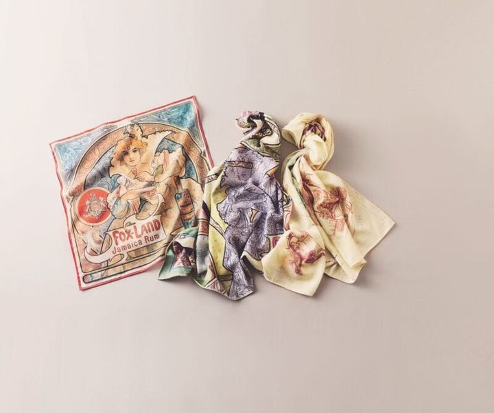 左から:ハンカチ ジャマイカ・ラム2640円、軽やかで薄手ながらも暖かく、とてもやわらかなウールシルク素材。中のウールシルクストールBは「フォックスランド・ジャマイカ・ラム」をポップにアレンジ、右のウールシルクストールAは1900年頃の宝飾品店のスケッチをモチーフにしたクラシカルなデザイン。各2万5300円(すべてミュシャ/マッシュスタイルラボ)
