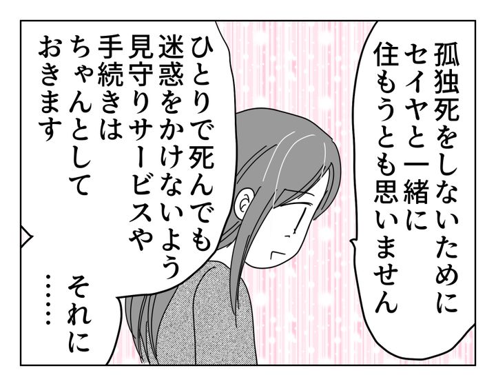 マイさんは、ようやく自分の気持ちをしっかりと伝えられるようになったのですね。人生の最期にそばにいてほしい相手が、息子のセイヤくんではなかったというのは、セイヤくんにとってかなり衝撃的だったのではないでしょうか。そう、マイさんはもう「母親」という肩書を捨てていたのです。セイヤくんに尽くした18年間で自分の役割は終えた。だからこそ、今度は再び「自分のため」にだけ生きていきたい。そう思ったマイさんなのでした。