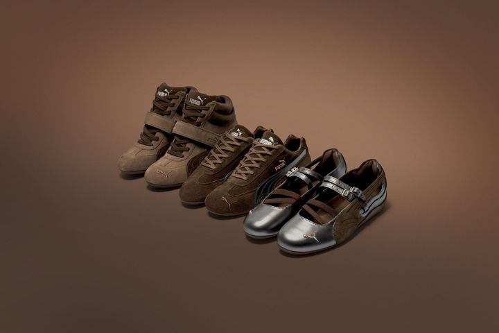 コレクションを象徴する「スピードキャット ウェッジ」は、外から見えない隠しヒール構造を採用し、ロープロファイルらしさを保ちながら新しい高さのバランスを加えたデザインに。バレエシューズの細身のラインを取り入れた「スピードキャット バレエ」は、足もとを柔らかくホールドするストラップが軽やかな印象を演出する。さらに、1999年のオリジナルを踏襲した「スピードキャット ラックス」は、ブラウンスウェードにメタリックグレーを効かせ、クラシックをモダンへとシフトさせた一足だ。いずれのモデルもブラウンスウェードで統一され、アーカイブのDNAを残しつつ、日常のスタイルに寄り添うニュートラルなムードに仕上がっている。