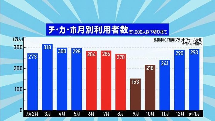 チカホの月ごとの利用者の推移をみると、夏も冬も利用者の数は変わりません。