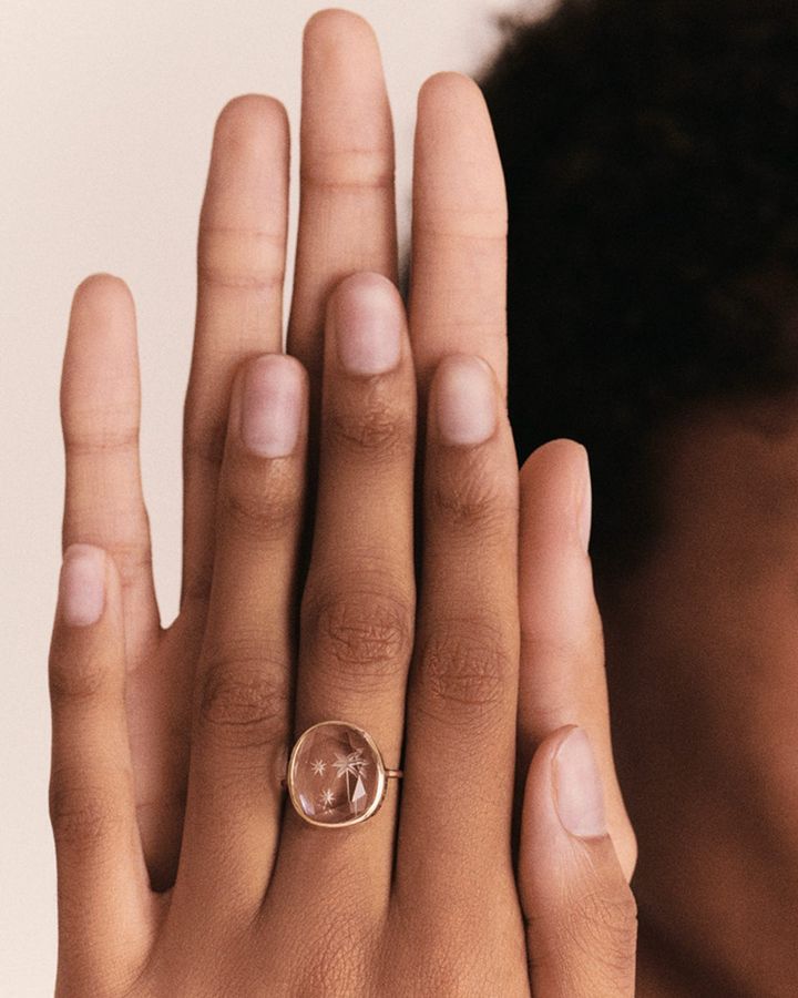 製作はインド・ジャイプールで行われ、天然石の内包物やわずかな色の揺らぎを味わいとして引き立てる、温かみのあるジュエリーが魅力。 デザイナーが選び抜いたロッククリスタルに、詩人エミリー・ディキンソンの言葉が刻まれたスペシャルなリングや、澄んだクリスタルに「愛の言葉」を刻んだネックレスなど、天然石ならではの個性が宿る一点ものが最大の持ち味。