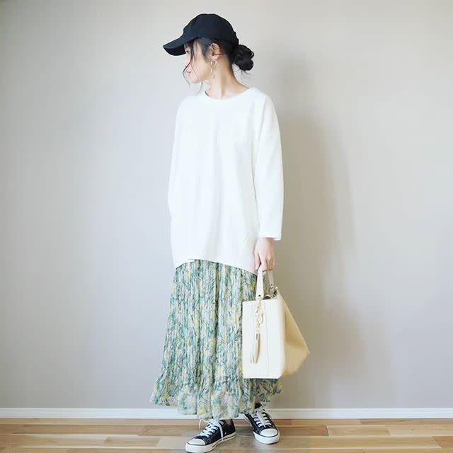 最近のスカートはロング丈が主流とあり旅行に最適。さらにスニーカーと合わせるコーデは観光や街歩き、ショッピングにぴったりマッチ。動きやすくてカジュアルなスカートを選ぶとスニーカーと馴染みやすくなります。