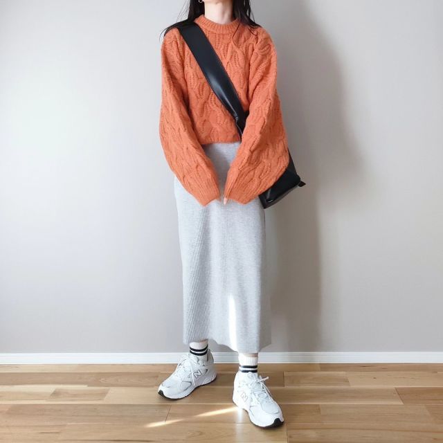 きれいめ・カジュアルの両方に使えるのが「リブニットのタイトスカート」。一般的にウエストゴムが多く展開されており、ストレッチ性も高いため穿き心地は抜群。ボリューミーなトップスと相性がよく、スカートのIラインが効いてコーデがスッキリまとまります。
