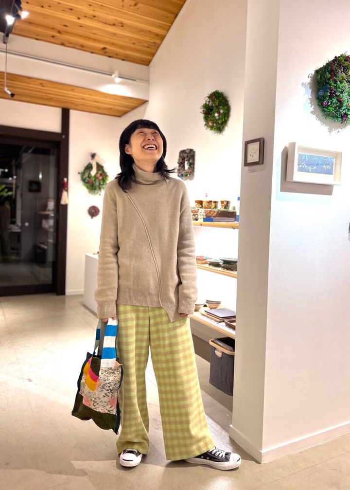 色の組み合わせが素敵なイエロー×ベージュのパンツは自身のブランド「Jamboree(ジャンボリー」。「随分むかしに手に入れたインポートの生地なんですけど、暖かさとこのなんともいえない落ち感が気に入ってます」。普段は縫い子として、時々こうしてポップアップに出店するのだとか。「トップスはシンプルめにして、ボトムスはこだわりの詰まったものを合わせることが多いです」。