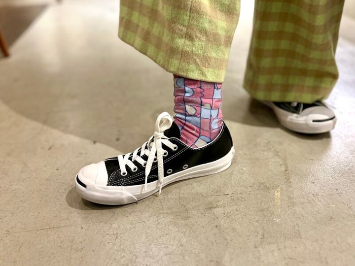 「見えないけど実は」とパンツの裾をたくし上げると、コンバースの足元には、おともだちのブランド「JUBILEE(ジュビリー)」の靴下。その名も「二日酔い」。「お気に入りすぎて、色違いの『泥酔』も持ってます」。