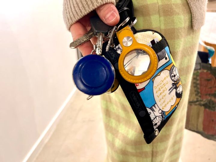 腰にジャラジャラといつでも必ず身につけている必需品は「仕事道具のメジャーと、エアタグです」。「レスポース」とドラえもんコラボのコインケース、「ヘキトマス」のメジャーキーホルダー、エアタグを、「braaa(ブラー)」のカラビナキーホルダーでベルト通しに引っ掛けて。「これとスマホがあれば、どこにでも出かけられます」。身軽!
