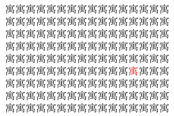 画像の中には、「寓」という漢字が縦に9行、横に16個並んでいます。 全部で144個となりますが・・・、そのうち1つは「異なる漢字」となってますよ!!