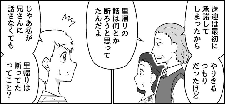 車に乗せてもサホさんはずっとスマホをいじって、ろくに返事をしないのだそう。それなのに里帰りの話を兄から強引に進められ、両親は困惑していたようです。私から兄に言わなくてもなんとかして断るつもりだったと教えてくれました。