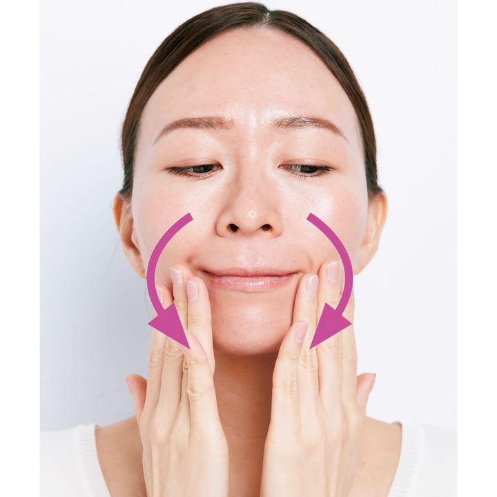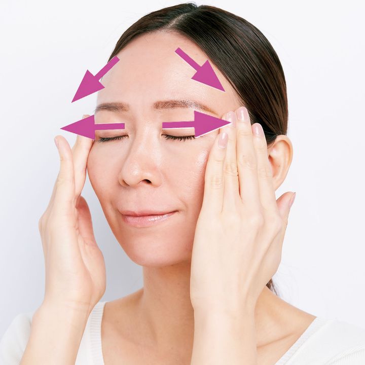 ①顔全体を中心から外側に向かい、肌に沿わせ優しいタッチでなじませます。