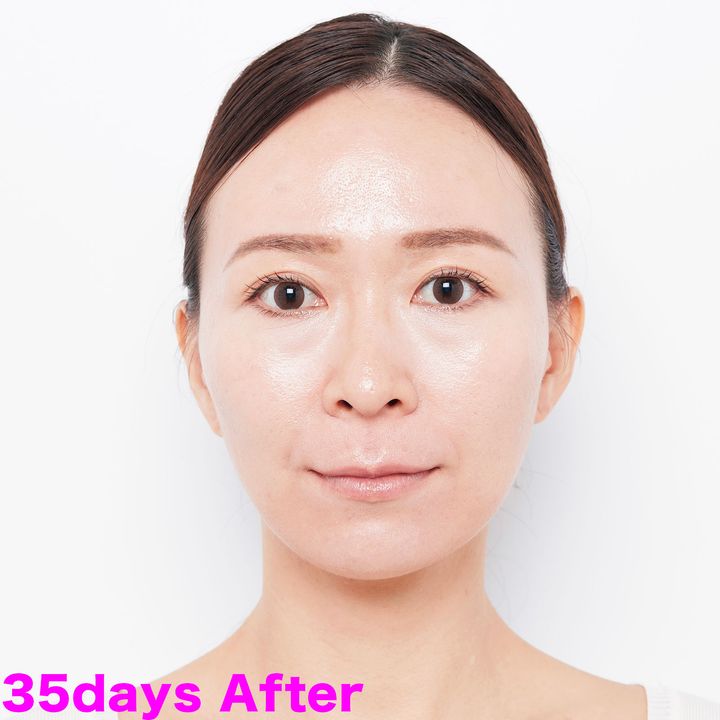 目の下のくぼみ感が2週間の使用後にふっくら整った。夏の肌荒れも改善。35日使ったら、さらに目元の影があきらかに浅く薄く変化。口元のもたつきもオフ。全体のハリ感もアップして肌の透明感もプラス。