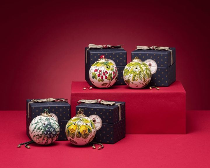 限定のホリデーアイテム「オーナメントボール型ホームフレグランス」も登場! トスカーナ伝統の陶器に、ブランドを象徴するフレグランス「ポプリ」の香りが閉じ込められています。オーナメントに描かれた植物のモチーフは、フィレンツェの職人が手書きでほどこしたもの。ポプリの原料となるローザ カニナ、ルッポロ、ミトロ、ローザ ジアッラの全4種です。オブジェやクリスマスツリーのオーナメントとして、空間に上質で華やかな雰囲気をもたらします。