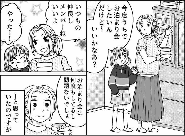 私はヨウコ。娘のユイは小5です。学校でのお友だちもたくさんできて、最近になってユイは「うちでお泊まり会をしたい」と言い出しました。お泊まり会は今までにも何度かしたことがありますし、ユイが呼びたいと言うのなら、わが家も大歓迎です。さっそくお泊まり会の計画を立てることにしました。今までは大きなトラブルもなかったので大丈夫だと思っていたのですが……どうやら今回は今までとは事情が違ったようです。さすがの私も頭を悩ませる事態に直面してしまいました。