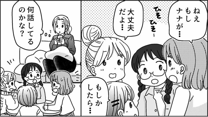 私がナナちゃんの食事ついて頭を悩ませている一方で、ユイたちは話し合いをしていました。その様子から、何か深刻な話をしているように見えました。「どうした? 何の相談?」ユイは慌てた様子で笑顔を作りました。でも、その笑顔はどこかぎこちなく感じられます。