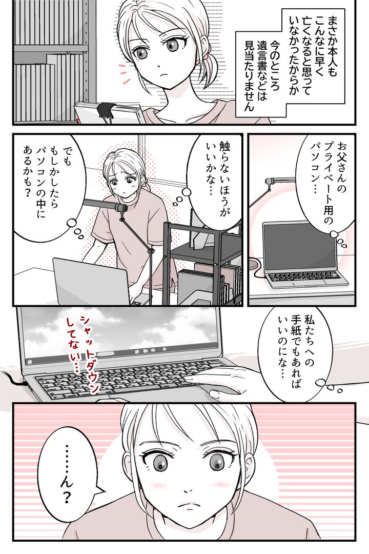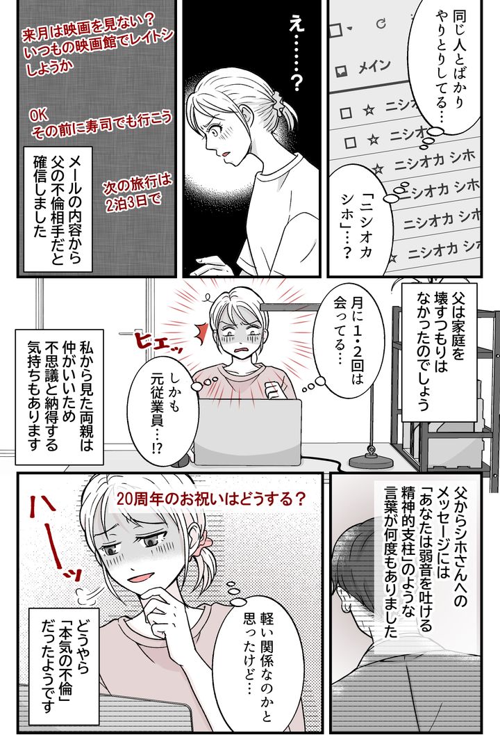 葬儀は姉が中心となって執り行ってくれたので、私は父の遺品整理を引き受けます。そして父のパソコンを確認してみると、「シホさん」という女性との親密なメールを見つけてしまいました。しかも20年にわたる本気の不倫だったのです。