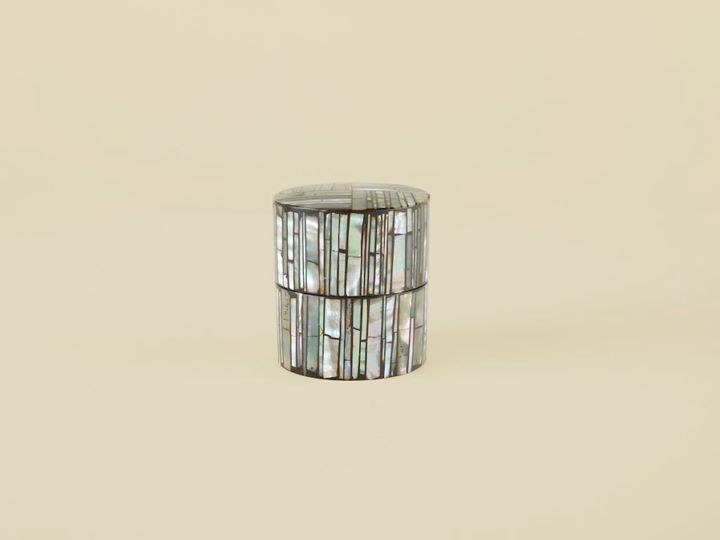 以前もいくつか紹介した、小島雄四郎さんの螺鈿(らでん)の棗(なつめ)です。縦に入った異なるリズム感の鮑の模様が、うっとりとしてしまうほど美しく、素晴らしい存在感を放っています。黒い漆と螺鈿のコントラストも、シャープな印象でかっこいいのです。茶道具である棗は、抹茶を入れて運ぶ容器のことを指し、日常ではあまり使うことのないものかもしれません。そこをあえて、傷や置き場所などに用心しつつ、身近な日用品として使ってくのも良いと思うのです。