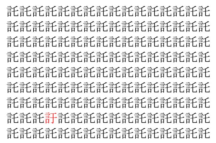 画像の中には、「託」という漢字が縦に9行、横に16個並んでいます。 全部で144個となりますが・・・、そのうち1つは「異なる漢字」となってますよ!!
