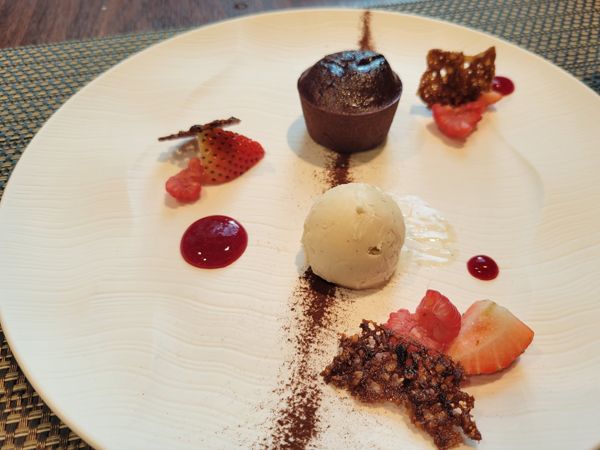 濃厚なフォンダンショコラとバニラアイス。ヴィーガン対応とは驚きです。ミルクの代わりにアーモンドを使用したヴァローナのヴィーガンチョコ、甘酒、グルテンを控えた米粉で作られた生地に、有機豆乳を使用したバニラアイスが添えられています。スパイスを感じるデュカがいいアクセントに。