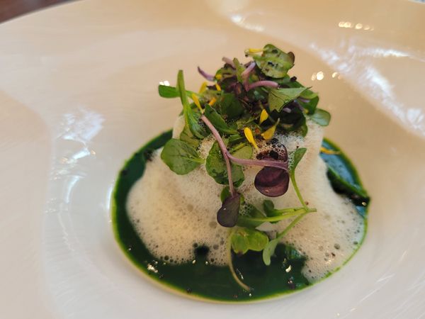 「平目のルーローとちぢみほうれん草 昆布と甘酒のエキューム」