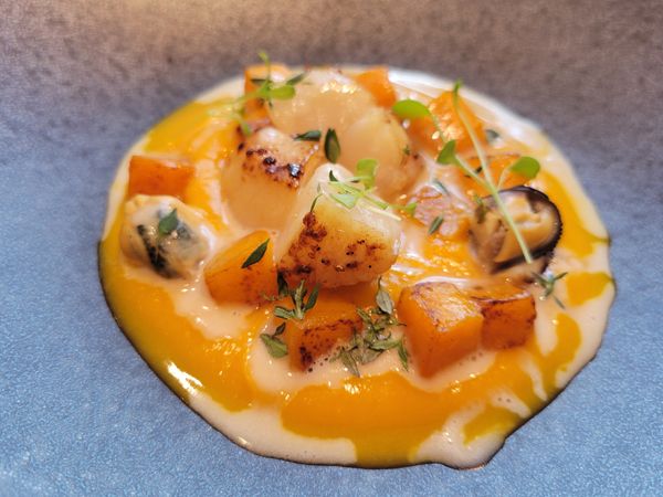 「バターナッツかぼちゃのポタージュ ソテーした帆立とヴァンジョーヌの香り」※ディナーのみ