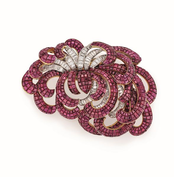 クリサンセマム クリップ 1937年 プラチナ、イエローゴールド、ミステリーセット ルビー、ダイヤモンド ヴァン クリーフ&アーペル コレクション © Van Cleef & Arpels
