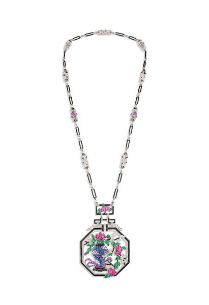 ロングネックレス 1924年 プラチナ、エメラルド、ルビー、サファイア、オニキス、エナメル、ダイヤモンド